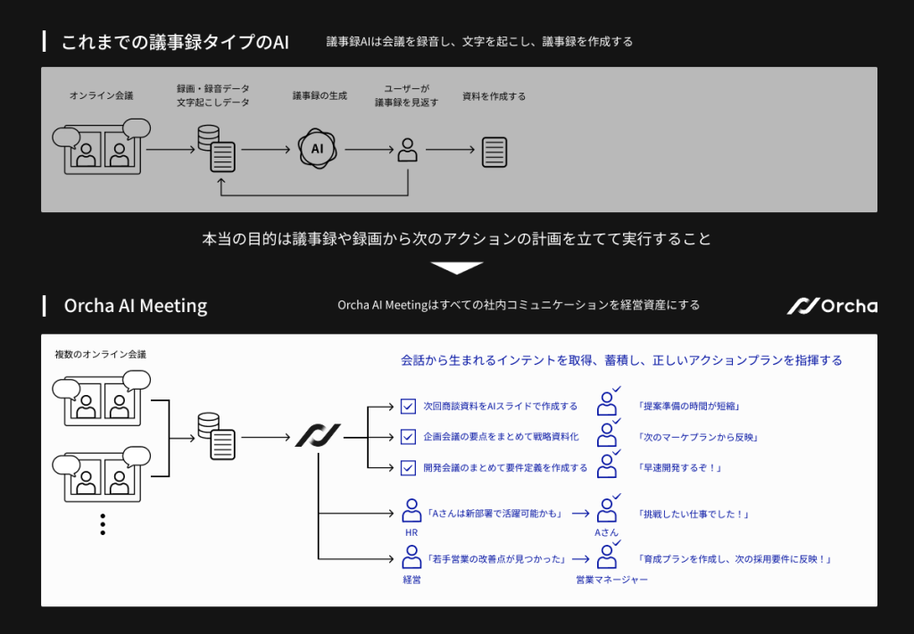 Orchaは、会話や商談、会議の録画・録音・文字起こしデータから“インテント”を抽出し、次のアクションにつながる具体的なプランを提示します。