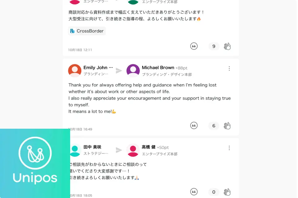 感謝を送りあう文化を大切にしています。急成長する組織では感謝を伝えることがベースとなり、信頼関係が構築されていくため、Sales Markerでは感謝をポイントにして送るUniposを導入しています。